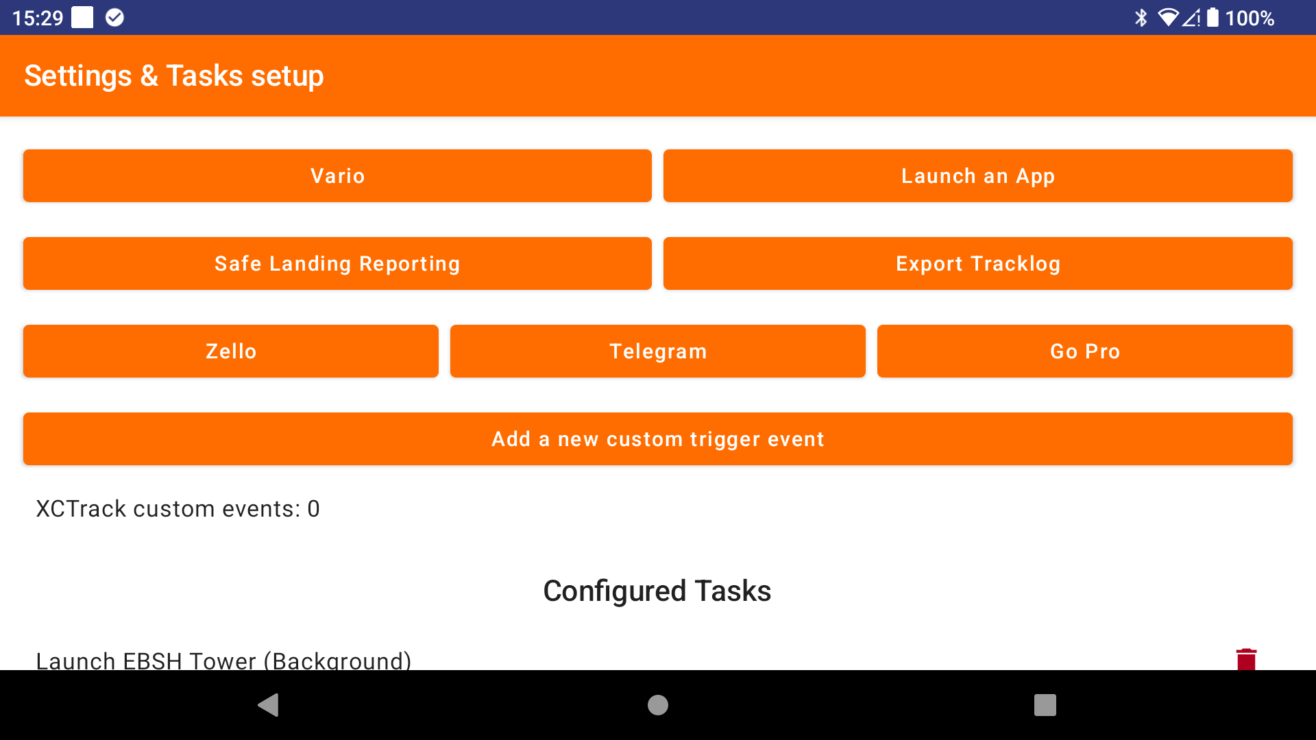 Jump directly to the right topic: Automation rules – Instant Lift, Weak Lift and Vario Sound – Custom sound – XCTrack Intent Launcher Widget – Add a new custom trigger event – Launch an App – GoPro – Zello Configuration – Telegram Configuration – Safe Landing Reporting – Export Tracklog