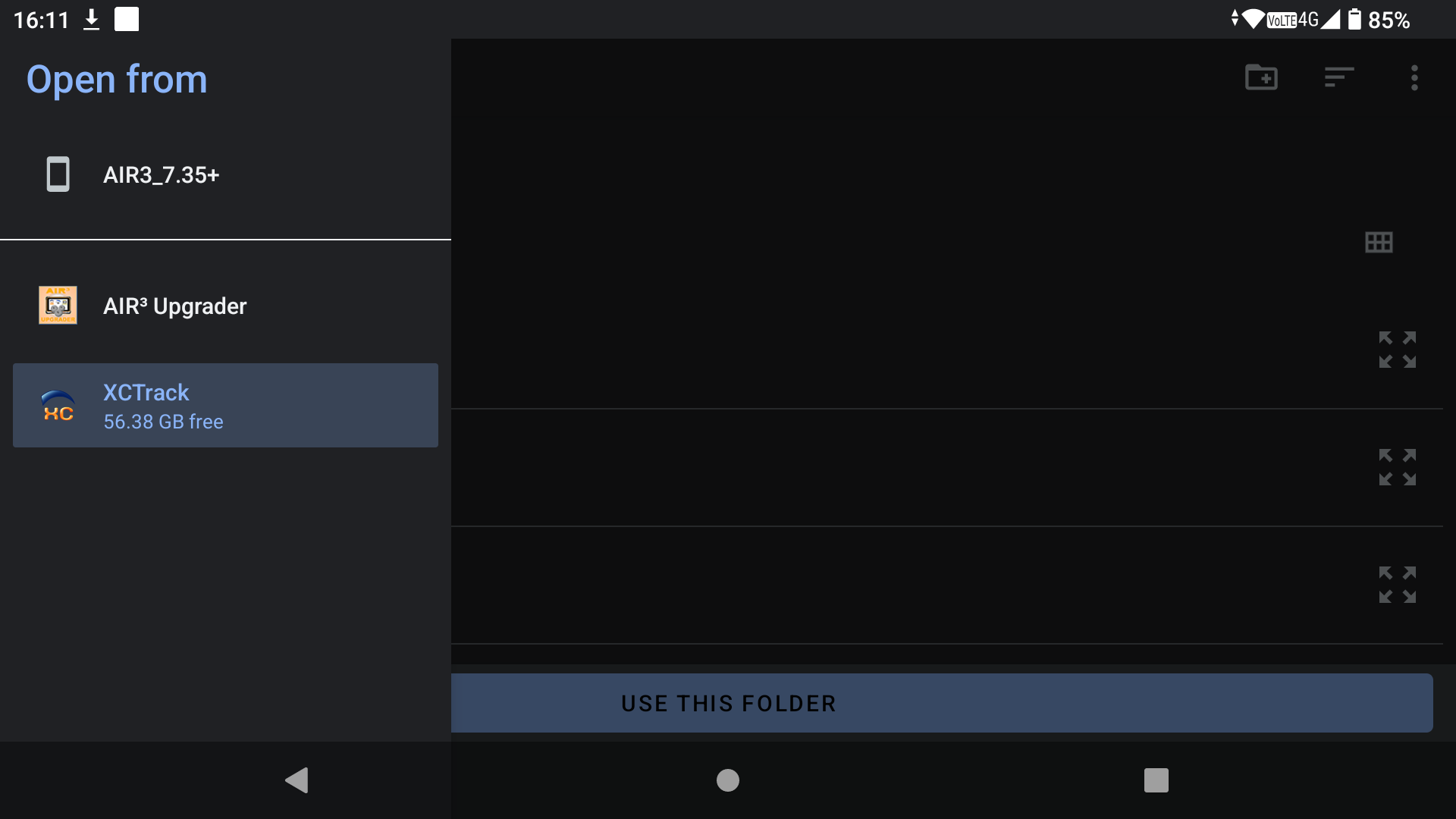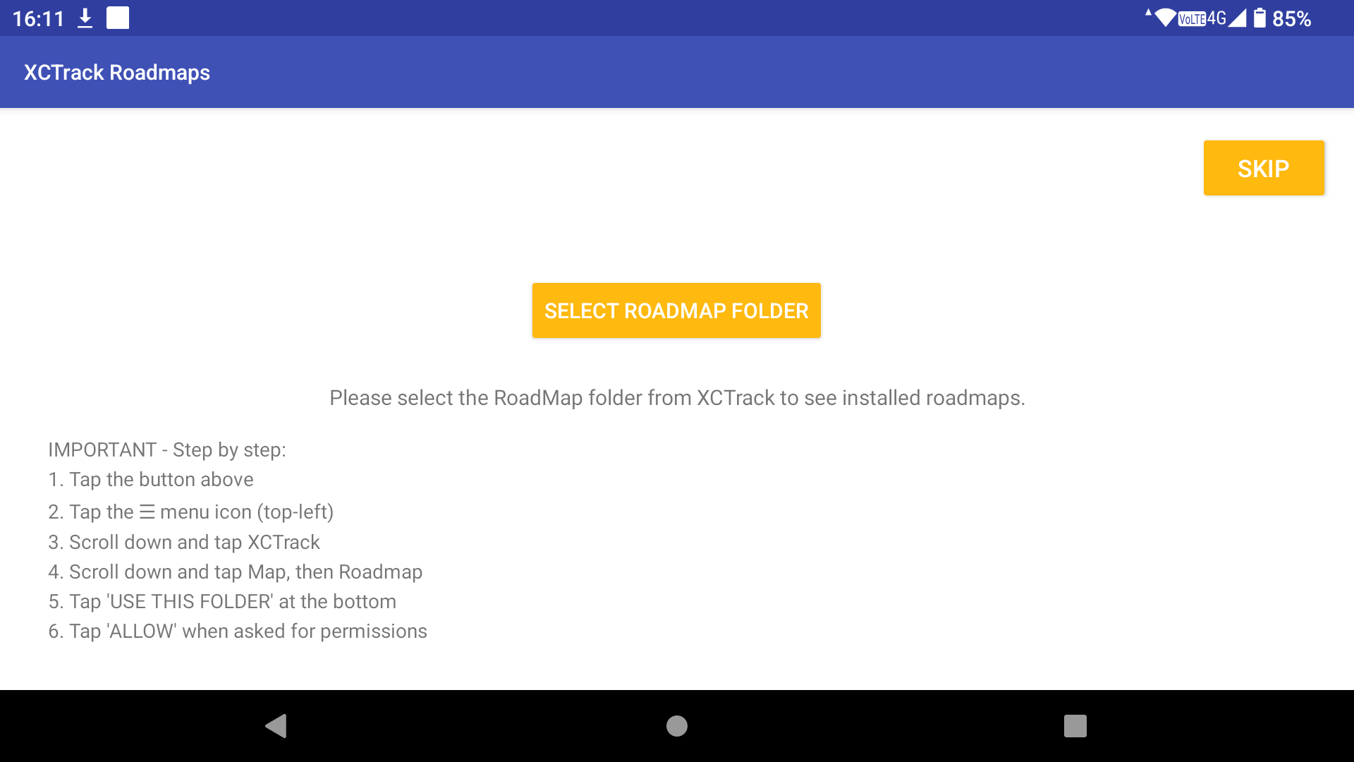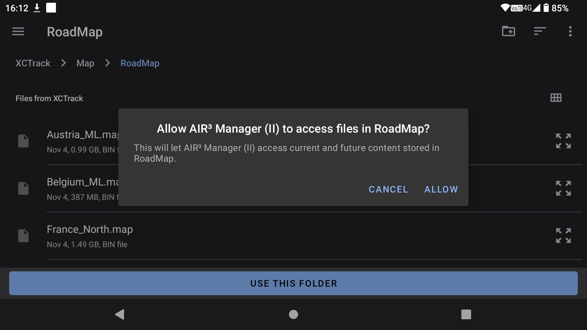 Avec XCTrack Roadmaps, vous pouvez consulter les Roadmaps disponibles sur votre appareil pour chaque pays. Pour ce faire, suivez les instructions pour sélectionner le dossier XCTrack Roadmaps.