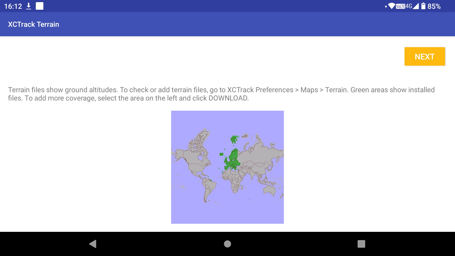 Pour vérifier ou ajouter des fichiers de terrain, allez dans Préférences XCTrack > Cartes > Terrain. Les zones vertes indiquent les fichiers installés. Pour ajouter davantage de couverture, sélectionnez la zone à gauche et cliquez sur TÉLÉCHARGER.