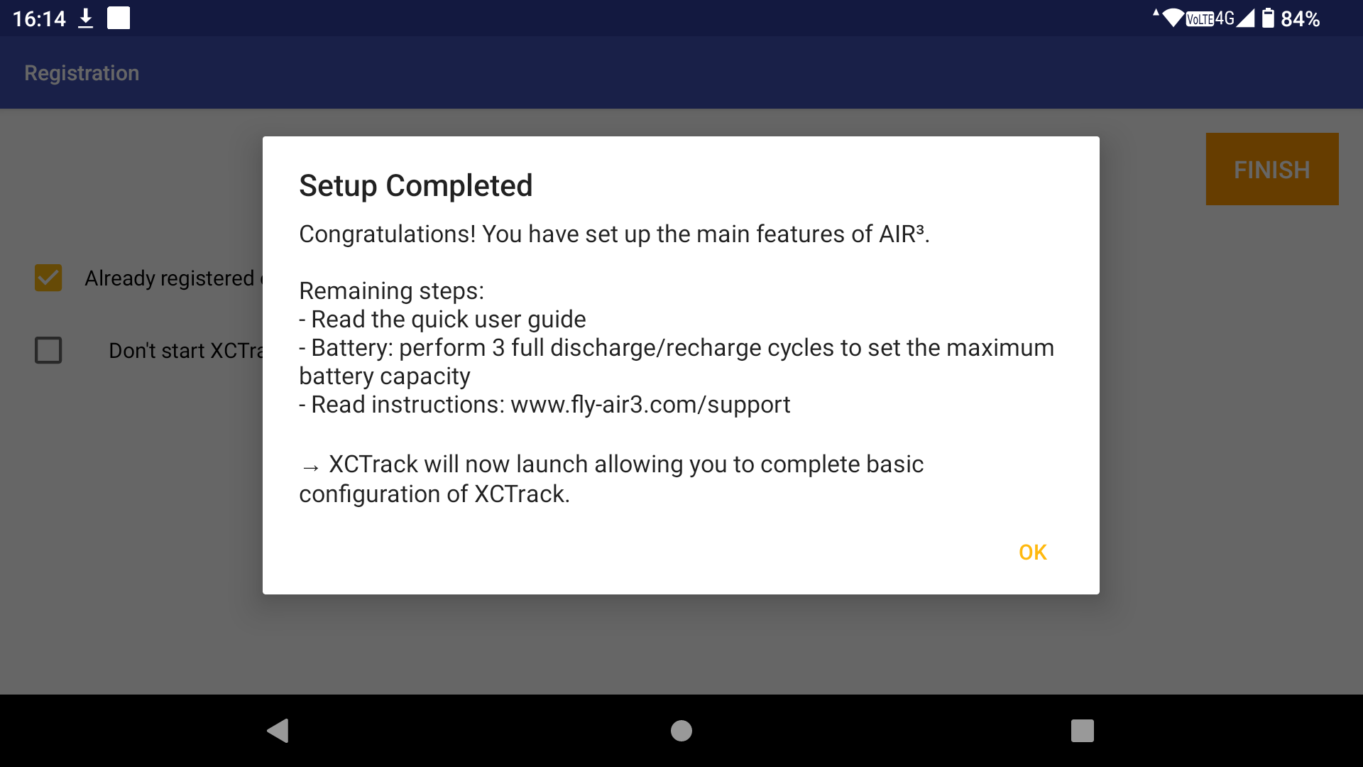 Si vous avez tout configuré correctement à l'aide de l'assistant, le message « Configuration de l'assistant terminée » s'affiche. Cliquez sur OK pour démarrer l'assistant XCTrack.