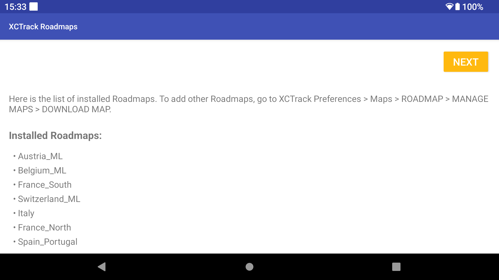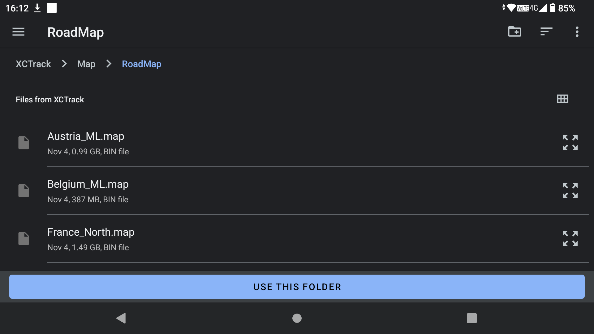 Une fois que vous avez sélectionné le dossier XCTrack Roadmaps, une liste des Roadmaps installées s'affiche.